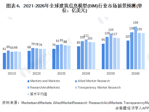 根据各大机构发布的全球建筑信息模型市场未来发展前景预测,2021-2026年全球建筑信息模型市场规模呈现上升趋势。预测显示,2026年行业市场规模在107-159亿美元之间波动。基于各个权威机构的未来预测数值可得,2026年全球建筑信息模型市场规模有望超过130亿元,年均复合增长率保持在约15%。综合来看,行业未来发展前景较好。