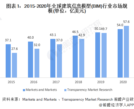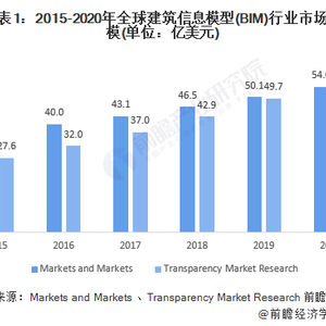 结合两大机构MarketsandMarkets和TransparencyMarketResearch的研究报告,2015-2020年,全球建筑信息模型市场规模逐年上升。根据MarketsandMarkets在2020年9月发布的《建筑信息模型(BIM)全球市场轨迹与分析》报告》,2020年全球建筑信息模型(BIM)市场规模在2020年约为54.0亿美元。而根据TransparencyMarketResearch的报告,2020年全球建筑信息模型市场规模达到57.6亿美元。且二者数据相差无几,可知2020年全球市场规模在54.0-57.6亿美元范围内。