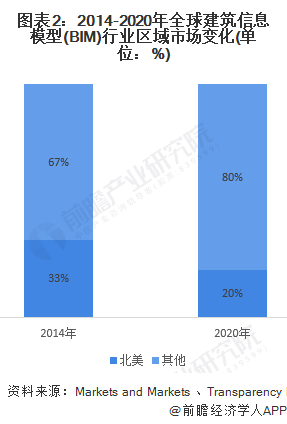 根据2014年TransparencyMarketResearch数据,北美是全球最大的BIM市场,在全球BIM市场中占比33%。而根据Mordor Intelligence发布的北美BIM市场发展报告显示,2015年BIM市场规模为11.8亿美元,到2020年北美地区市场规模增长至21.5亿美元,结合MarketsandMarkets测算的2020年全球市场规模可知,北美区域市场规模占比约为20%,区域市场占比下降约13个百分点。