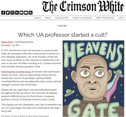 1997年,39名“天堂之门”邪教信徒集体自杀,幻想藉此登上通往天堂的飞船。该邪教创始人马歇尔·阿普尔怀特(Marshall Applewhite)在上世纪60年代中期曾在阿拉巴马大学担任过几年音乐教授。随后,他去了圣托马斯大学,最终陷入精神失常。