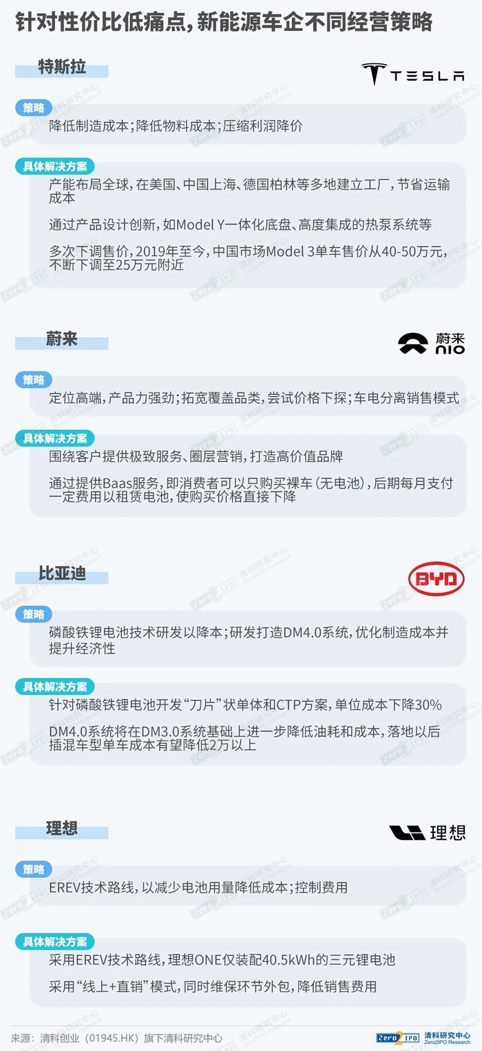 04、代表性车企通过不同经营策略,解决或缓和性价比弱、里程焦虑的行业痛点问题