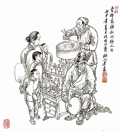以前的秋冬时节,天津卫的街头巷尾常见吹糖人的小贩。吹糖人,要有手艺。吹糖人用的糖稀是以麦芽和黏米熬成的。吹糖人时,师傅用一个小竹筒挑一圈糖稀,然后用它吹出苹果、桃子、小鸟、老鼠偷油等造型。