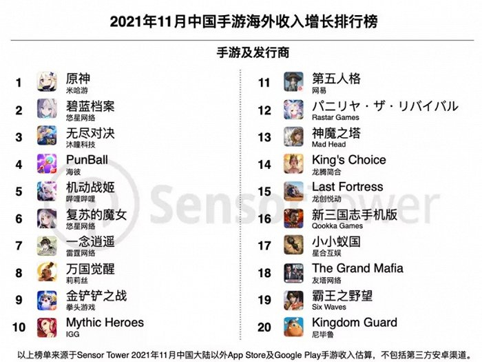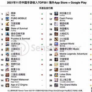 日前,Sensor Tower发布了2021年11月中国出海手游收入榜与收入增长榜,为我们带来最新的海外市场趋势。