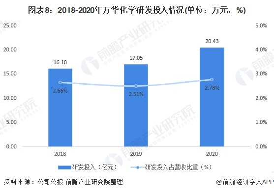 2018-2020年,公司的研发投入逐年升高,研发强度波动变化。目前,万华已经形成了从基础研究、工程化开发、工艺流程优化到产品应用研发的创新型研发体系,成功组建了“国家聚氨酯工程技术研究中心”、“聚合物表面材料制备技术国家工程实验室”、“国家认定企业技术中心”、“企业博士后科研工作站”等行业创新平台,承担建设“国家技术标准创新基地(化工新材料)”。2020年,公司研发投入为20.43亿元,研发强度为2.78%,较2019年增长0.27个百分点。