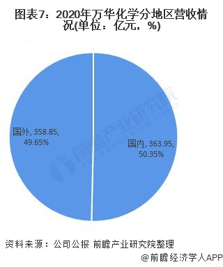 2020年,万华化学国内外收入相差不大,国内实现销售收入363.95亿元,比为50.35%;国外实现销售收入358.85亿元,占比为49.65%。