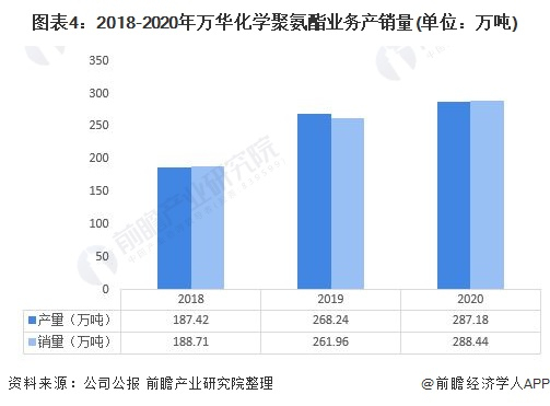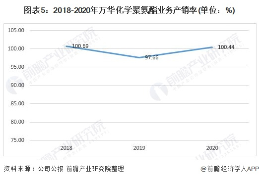 2018-2020年,万华化学聚氨酯业务产销量均呈上升趋势。2020年,万华化学聚氨酯系列产量为287.18万吨,销量为288.44万吨,产销率为100.44%。整体来看,需求大于供给。