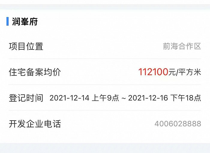 润玺二期的入围公布后,前海润峯府立刻备案了743套住宅,均价11.21万元/平方米,总价约1099-2052万元/套。