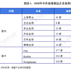 本文核心数据:中外血液制品企业血浆站数量对比、血液制品代表企业血制品种类对比、中外血液制品消费量对比