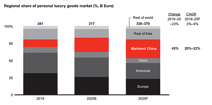 中国奢侈品市场已经成为了全球奢侈品行业的增长引擎,在LVMH的首席财务官Jean-Jacques Guiony看来,中国是奢侈品行业最大也最稳定的市场。咨询公司Bain & Company曾预计中国有望在2025年成为全球最大的奢侈品消费市场,疫情的发生则加速了这一进程。根据Jefferies的研究报告,自疫情发生以来,中国在全球个人奢侈品消费中的份额激增,自2019年的38%上下猛增到80%。