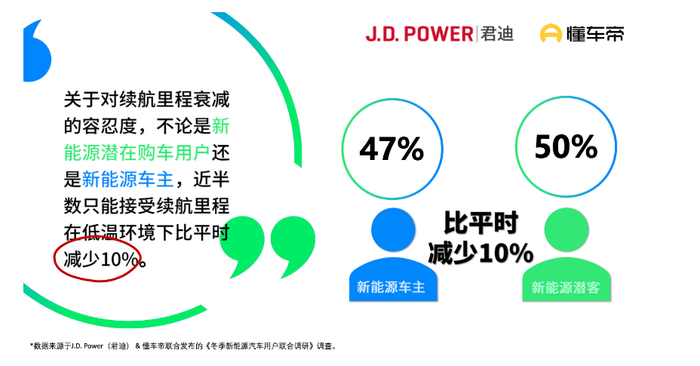 在一项关于“消费者对续航里程衰减容忍度”的调查中,近半数被调查者表示只能接受续航里程在低温环境下比平时减少10%。其中,新能源车主和潜在消费群体持有这一观点的比例分别为47%和50%。