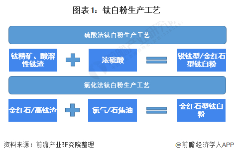 目前,全球钛白粉的生产工艺主要有两种,分别是硫酸法和氯化法,前者产品品质差于氯化法,但全球两种工艺的使用量平分秋色,中国则主要采用硫酸法工艺。