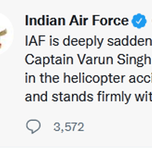 【环球网快讯】印度空军刚刚在推特上证实,12月8日在印度南部泰米尔纳德邦的军机坠毁事件中,唯一幸存者瓦伦·辛格已于15日去世。