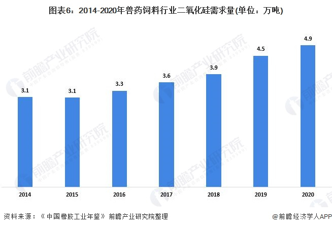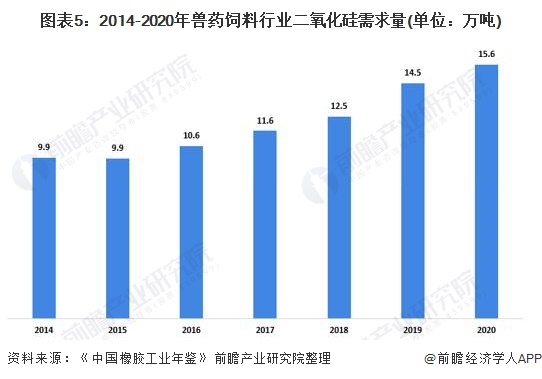 沉淀法二氧化硅在饲料添加剂中主要作为吸附剂和增加饲料的流动性,特别是在维生素E中用量较大。目前,兽药饲料行业中二氧化硅的需求量几乎全部为沉淀法二氧化硅。2020年兽药饲料行业对二氧化硅的需求量在15.6万吨左右。随着我国禽畜饲养业进一步的发展,饲料行业对二氧化硅的需求趋于增加。