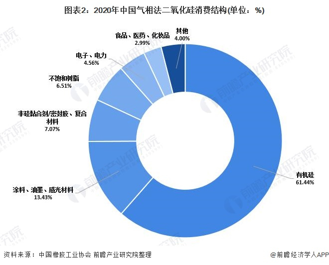我国气相二氧化硅主要用途是作为有机硅弹性体补强剂,目前在橡胶领域的使用量占其总消费量的60%以上。另外,在其他有机硅产品如硅树脂中也有少量应用;涂料、油墨工业是国内气相二氧化硅的第二大消费领域,占总消费量的13.5%左右;在非硅黏合剂/密封胶、复合材料、化学机械抛光(CMP)行业,气相法二氧化硅应用也保持较快增长。此外,蓄电池、医药、橡胶工业、食品、农业、化妆品、日化、造纸、润滑油等领域对气相二氧化硅的需求也呈现增长态势。