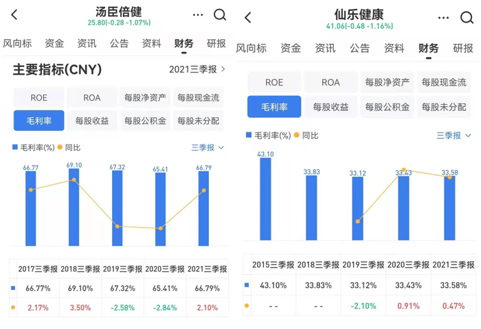 就拿做to C的汤臣倍健为例,根据财报数据显示,2018年-2020年,毛利润均在62%-66.79%,在最新披露的2021年q3季度,更是拿下了66.79%的毛利率;而to B的仙乐健康,这三年中毛利率一直稳定在32%-34%,2021年q3季度,毛利率也仅有33.58%。不难看出,二者毛利率差了相近一倍。