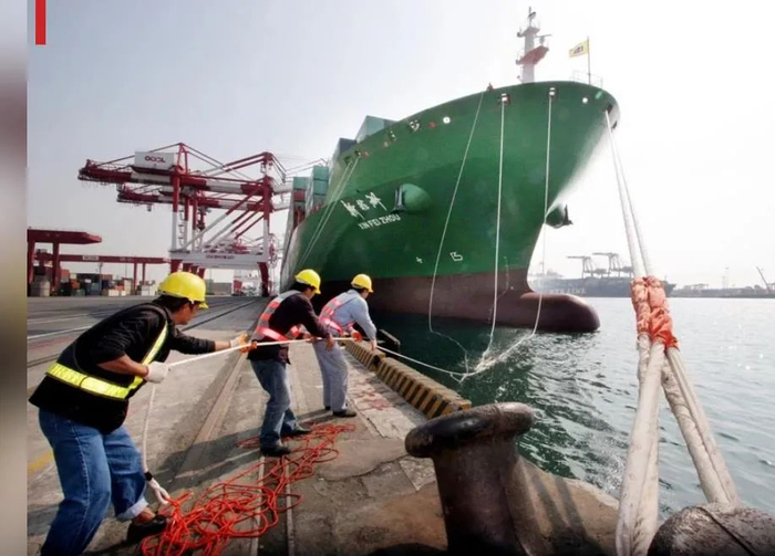 2008年12月15日,中海集团“新非洲轮”靠岸台湾高雄港,这是两岸直航后,第一艘从大陆抵达高雄的货轮。(图源:台湾“联合新闻网”)