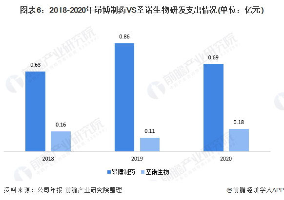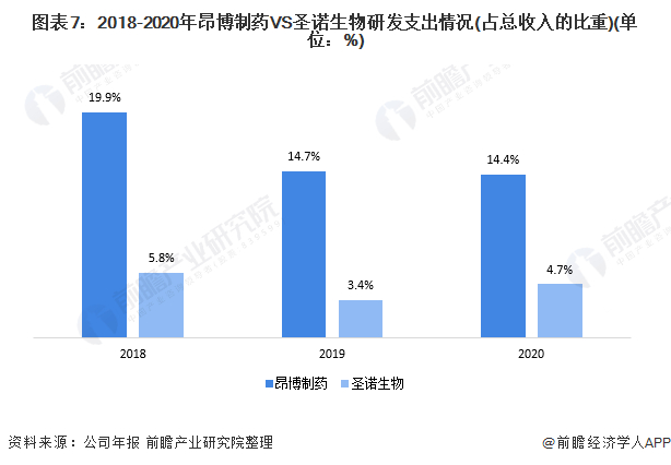 从研发支出的角度来看,昂博制药的研发支出一直远远超过圣诺生物,其从2016年的0.63亿元波动至2020年的0.69亿元;而圣诺生物则是从2016年的0.16亿元波动至2020年的0.18亿元。从占总收入的比重角度来看,虽然昂博制药近年来的比重呈现下跌态势,但昂博制药的比重也远远超过圣诺生物。