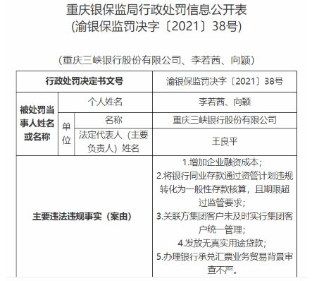 罚单显示,重庆三峡银行此次的具体违法事实包括,加企业融资成本;将银行同业存款通过资管计划违规转化为一般性存款核算,且期限超过监管要求;关联方集团客户未及时实行集团客户统一管理;发放无真实用途贷款;办理银行承兑汇票业务贸易背景审查不严。