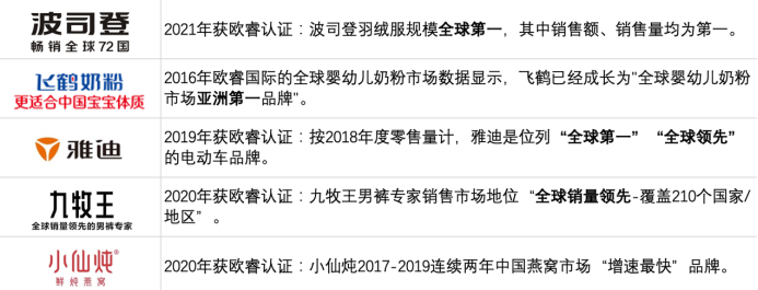 2016年,“更适合中国宝宝”的飞鹤奶粉曾获得欧睿认证,成为“全球幼婴儿奶粉市场亚洲第一品牌”;2019年,“销往英国、美国、德国等全球77国”的雅迪,亦在欧睿的认证下,成为“全球领先”和“全球第一”的电动车品牌。