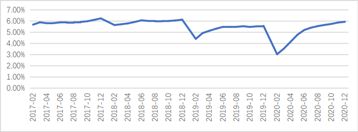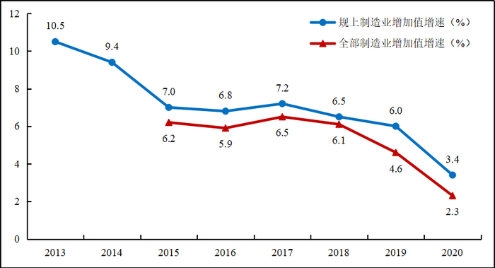 (四)产业内卷导致宏观层面制造业持续增长动力不足。内卷情况下,产能必然相对过剩,企业大多在中低端无序竞争,缺乏技术投入和产品创新的资金实力,将导致制造业总体上持续增长动力不足,一定程度上讲导致增长乏力、增速持续下滑。2013年以来,中国制造业增加值增速呈现明显下降趋势,2019年规上制造业增加值增速降至6%,较2013年的高点回落了4.5个百分点(见图2)。从行业情况看,大部分行业呈现增速逐步下降的趋势,其中装备制造业增加值增速从2017年最高12.0%以上下降至2019年末的6.7%;医药制造业增速从2017年最高12.4%下降至2019年末的6.6%;通用设备制造业从2017年最高的11.2%下降至2019年末的4.3%。