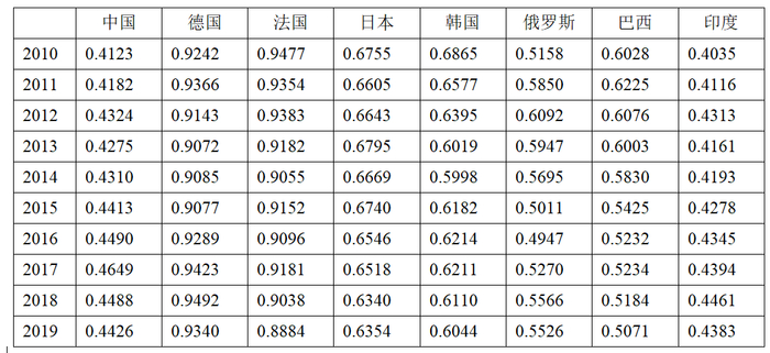 (三)产业内卷导致全要素生产率不升反降。内卷情况下,企业难以获得足够的利润支撑企业持续加大研发投入,不仅导致企业难以实现差别化发展,也造成中国全要素生产率难以显著提升。长期以来,中国全要素生产率低于美国、德国、法国、日本、韩国等先行发达国家,与俄罗斯和巴西也有不小差距(见表2)。2019年,中国全要素生产率只有美国的44.26%,而德国、法国的全要素生产率为美国的85%以上,日本、韩国为美国的60%以上,俄罗斯、巴西为美国的50%以上。从变动看,近两年中国全要素生产出现小幅回落,2019年只有2017年的98.97%,而美国、日本、韩国、俄罗斯、印度等全要素生产率仍在提升,只有巴西降幅略高于中国。全要素生产率水平持续下降,也进一步表明中国制造业高质量发展的动力来源不足。表2 中国与主要国家全要素生产率对比(美国=1)