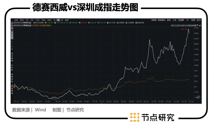 从德赛西威2017年12月上市至今的历史走势(周k线)来看,总体上,德赛西威大幅跑赢了大盘,从2017-12-29的23.93的开盘价至2021-12-08的134.4的上午收盘价,增长4.6倍左右,同期大盘指数深证成指从11102.16的开盘价升至14925.47的上午收盘价,涨幅不到百分之35%;分阶段来看,德赛西威的主升浪从2020年4月份才真正开始,在一年半左右的时间里便从29.11涨至141.13的最高点,股价翻了将近5倍。