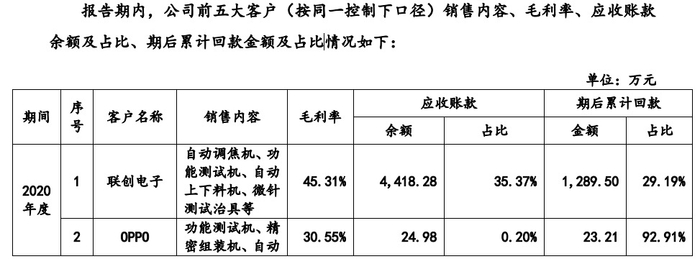 然而除了毛利率下滑,更加让人担忧的,是对不同客户销售毛利率出现较大差异,尤其对瑞声科技销售的毛利率只有15.69%,大幅拉低了2020年的毛利率水平。销售产品同样是“自动调焦机、功能测试机、微针测试治具”等,对联创电子的销售毛利率则有45.31%。