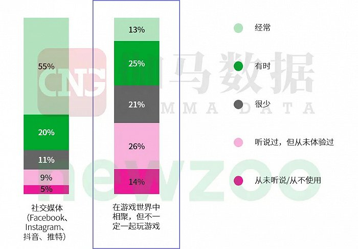 人们对类元宇宙的游戏活动的认知度很高,使用情况也是如此。