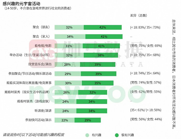 Newzoo和伽马数据的研究显示:游戏玩家潜在的兴趣较高,但类元宇宙的活动也吸引了相当多目前不玩游戏的消费者。