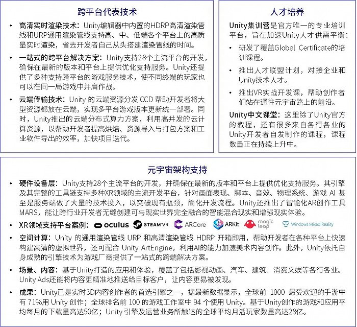 在元宇宙架构支持层面,Unity在多个相关维度具备技术支撑,并且持续探索元 宇宙的关键技术,从原生平台开发、接口开放等多维度提供完整的工具链,在XR生态、引擎技术、云端算力等方面提供技术支持。
