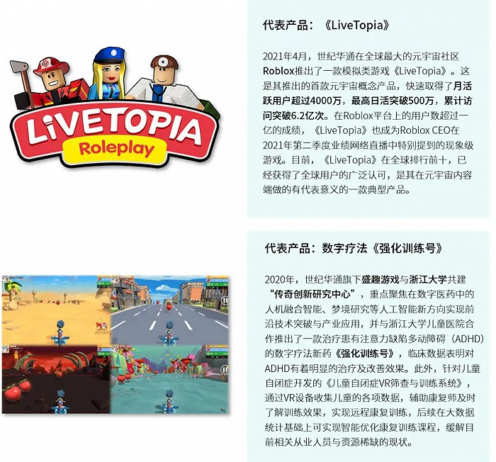 世纪华通在与元宇宙相关的产品内容、脑科学、AR/VR、云游戏等领域均有所布局,为元宇宙生态的发展从技术、商业合作等各层面进行尝试和拓展,触达更多元宇宙领域。在产品内容上,世纪华通强化自研产品《LiveTopia》在全球范围已取得一定成绩;在脑科学层面,世纪华通重点布局“数字孪生”领域,旗下产品在治疗失眠、儿童注意缺陷与多动障碍均获得了阶段性成果;在AR/VR、云游戏等领域,世纪华通通过商业合作的形式链接产业链上下游,借助投资方式扩大元宇宙相关业务布局,以实现全链路的技术输出和多领域技术协同。