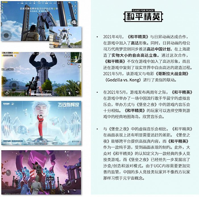 在2021年的腾讯年度游戏发布会上,腾讯对元宇宙相关的战略布局占据了较为重要的位置。腾讯将整体布局可以解释为“超级数字场景”,这也是“早期”元宇宙所呈现的趋势。这些趋势包括通过扩展内容、社交互动和增加线下活动来模糊现实和虚拟世界之间的界线。在当前环境下,腾讯比所有西方公司都更加重视线下活动,因而推出了超级数字场景合作开发项目,旨在为玩家提供线下活动中的沉浸式游戏体验。在具体实施策略上,腾讯正在通过近期的一系列联名合作活动,逐步实现《和平精英》中的元宇宙概念,包括增加非游戏目标和引入更多的自定义内容。在即将推出的绿洲启元模式中,玩家将可以自由编辑游戏地图、武器、载具等。