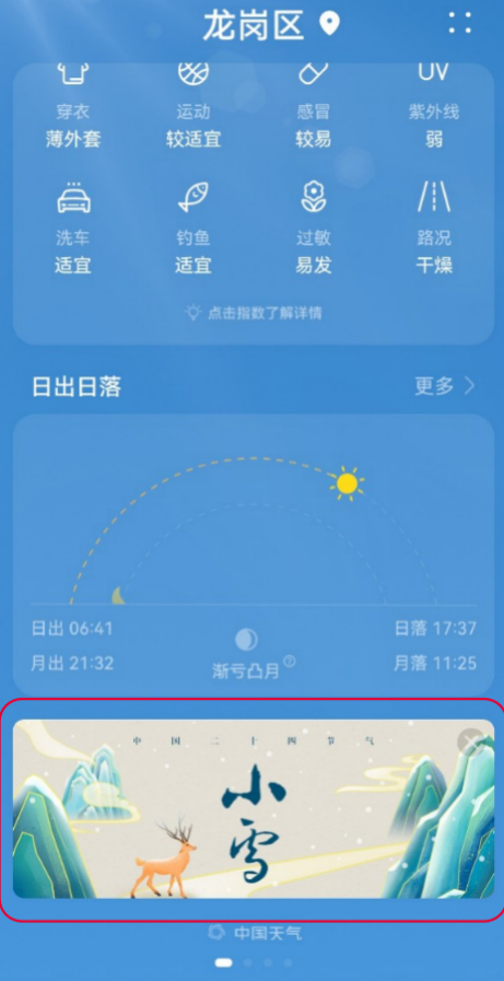 在首页底部还新增了“精选专题”栏目。用户可以在“精选专题”栏目详细了解关于节日节气、气象知识科普、生活美食等相关内容。丰富有趣的资讯内容,融入用户的生活点滴,让用户感受贴心、专业的天气服务。