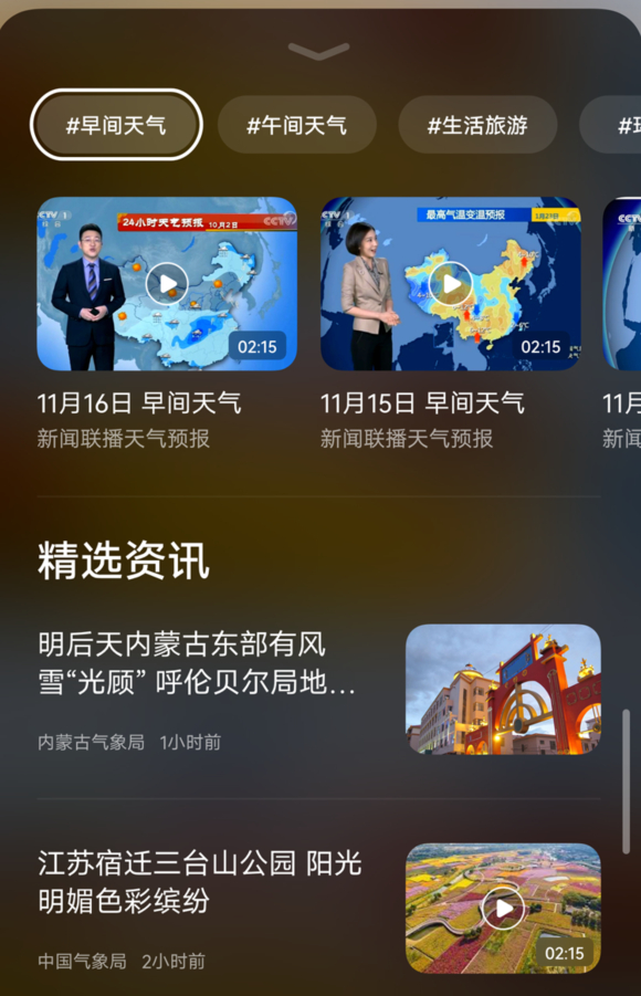 优化后的“视频天气预报”页面除在视觉上有更好的体验外,在内容上对早间天气、午间天气、晚间天气都做了详细划分和展示。用户可以直观、清晰、快捷地查看想要了解的具体时段天气,让天气预报准确到小时,更好的规划行程安排。
