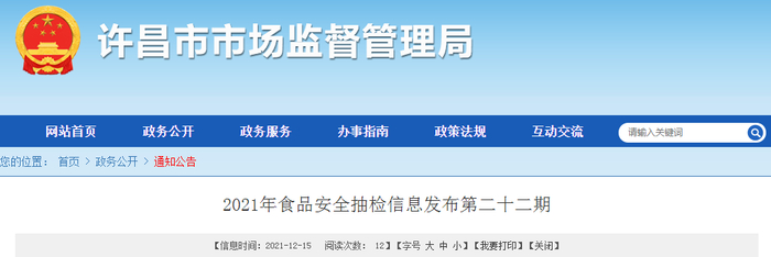 河南省许昌市市场监管局发布2021年第二十二期食品安全抽检信息