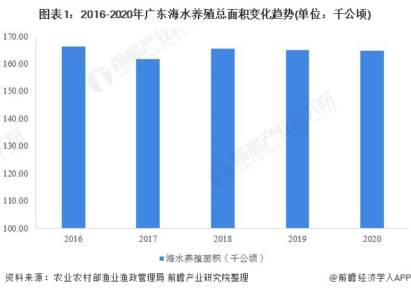 2016年以来,广东省海水养殖总面积总体维持在160千公顷左右,到2020年,全省海水养殖面积为164.72千公顷,较上年同期基本持平。
