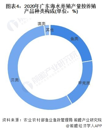 从海水养殖的养殖产品来看,目前广东省贝类产品产量最高。2020年,全省贝类海水养殖产量为196.21万吨,占总产量的56.2%;甲壳类海水养殖产量为62.96万吨,占总产量的19.0%;鱼类海水养殖产量为74.28万吨,占总产量的22.4%。