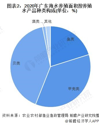 从水产养殖面积构成来看,目前广东海水养殖中贝类养殖面积最大,到2020年,全省海水养殖贝类面积为67.13千公顷,占总面积的35.9%,海水养殖鱼类水产品面积为33.22公顷,占总面积的20.2%;甲壳类水产养殖面积为59.09千公顷,占总面积的40.8%。