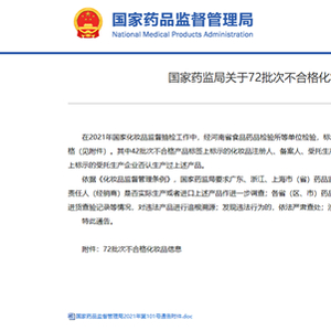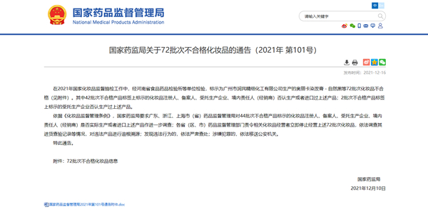 中国网财经12月16日讯 今日,国家药监局发布关于72批次不合格化妆品的通告(2021年 第101号)。