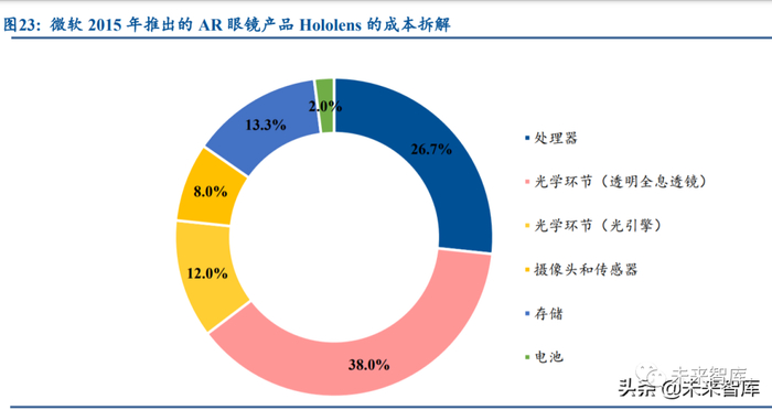 成本方面,光学环节占比较高。以微软的 AR 眼镜产品 Hololens 为例,其基本构成部分包 括了处理器、光学透镜、光引擎、摄像头、传感器、存储和电池。其中,和光学直接相关的(光学透镜和光引擎)成本占比近半,因而相关厂商有望充分受益于相关硬件产品的需求放量。
