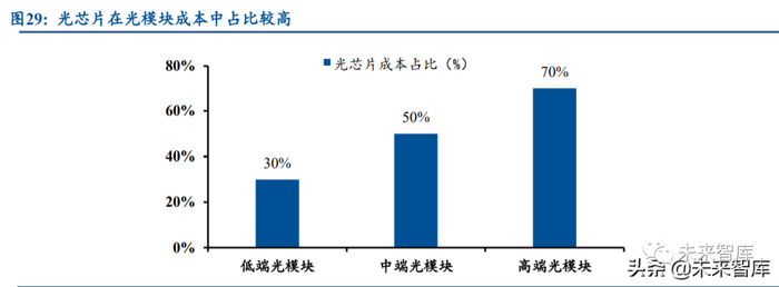 产业链上游光器件行业的整体竞争格局良好。虽然光器件产品品类繁多,部分低端产品的 入门门槛不高,但是头部厂商往往基于自身优势聚焦于不同的高端细分领域,这些领域的市场 规模不大、竞争对手不多、竞争并不激烈,因而整体格局良好,毛利率水平通常能够维持在高 位。以光库科技为例,公司在光纤激光器件领域重点聚焦高功率、高壁垒赛道,高功率隔离器 及高功率光纤光栅的全球市占率均超 50%,光纤激光器件业务的毛利率维持在 40%~50%的范围 内。(报告来源:未来智库)