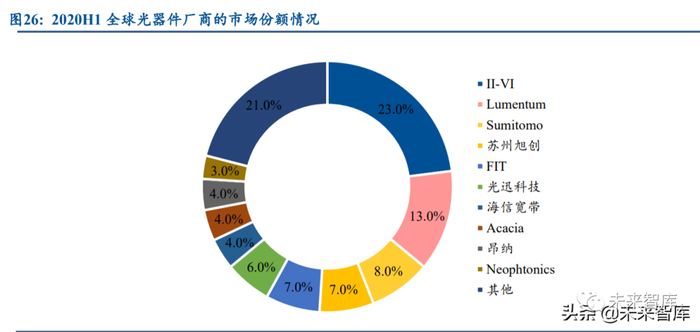虽然并购加速行业整合助推行业集中度提升,但当前行业集中度仍不高。根据和弦产业研 究中心的统计,2020H1 市场份额排名前三的分别为 II-VI、Lumemtum、Sumitomo,占比分别 为 23%,13%和 8%。虽然行业内的并购整合给行业集中度带来了边际改善,但集中度仍不高。