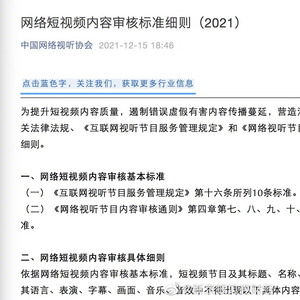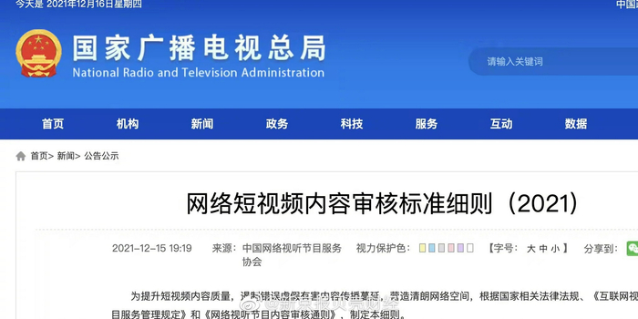 12月15日晚,国家广播电视总局官网也发布了《网络短视频内容审核标准细则(2021)》。