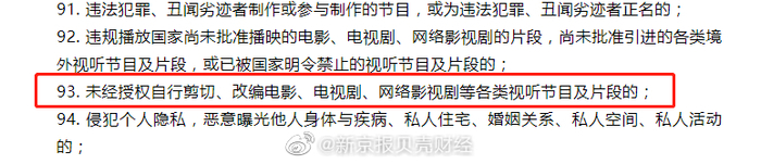 具体而言,第92条规定,不得违规播放国家尚未批准播映的电影、电视剧、网络影视剧的片段,尚未批准引进的各类境外视听节目及片段,或已被国家明令禁止的视听节目及片段;第93条规定,不得未经授权自行剪切、改编电影、电视剧、网络影视剧等各类视听节目及片段。