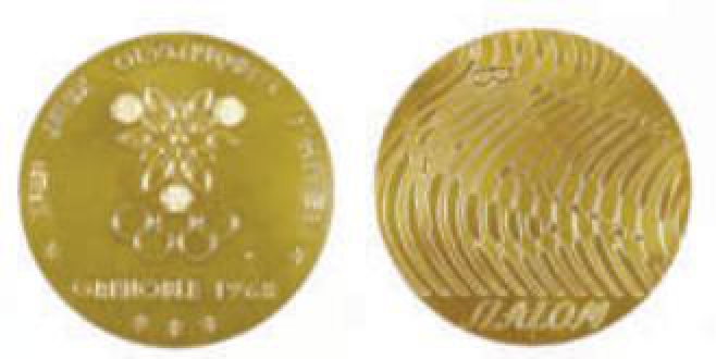 1968年格勒诺布尔冬奥会奖牌,背面设置了运动项目象形图,属奥运史上首次。