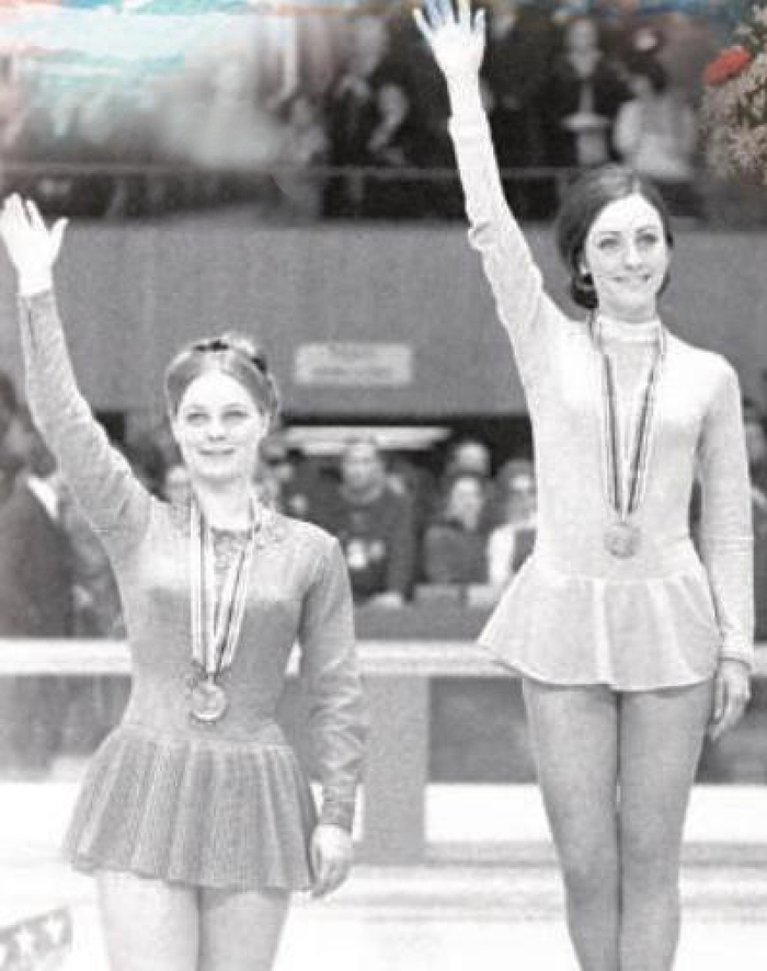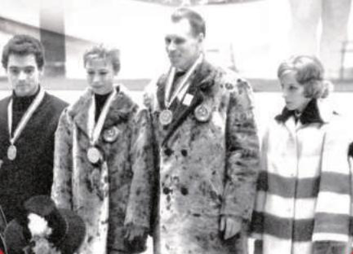 1968年格勒诺布尔冬奥会花样滑冰颁奖仪式。这届冬奥会奖牌是挂在一根多彩的条纹缎带上。
