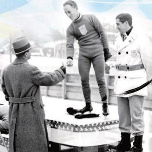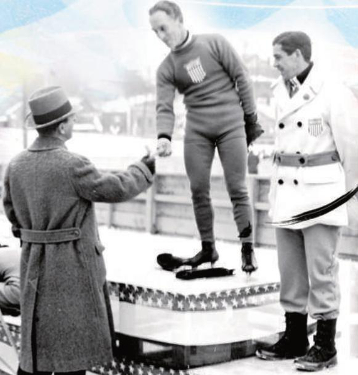 1932年普莱西德湖冬奥会,美国选手摘得男子5000米速度滑冰金、银牌。有趣的是,颁奖时,铜牌获得者加拿大选手(画面最左边)正在脱冰鞋。