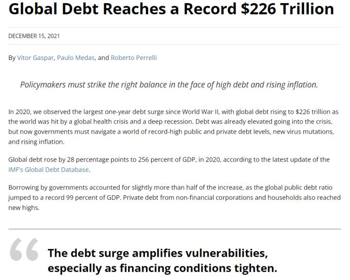 就在美联储公布12月FOMC决议前几个小时,国际货币基金组织在官方博客发布了一份研究报告,警告全球央行货币政策转向的过程,可能会对疫情期间激增债务的可持续性造成冲击。