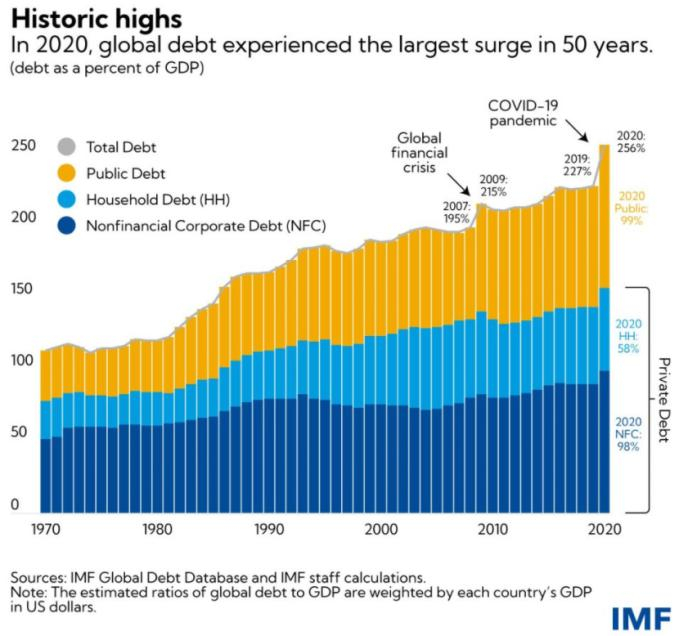 根据IMF最新的全球债务数据库,该组织宣布2020年全球债务水平达到226万亿美元,与GDP的比例激增28%至256%,这也是二战后债务水平上升最快的一年。眼下全球政府需要在创历史新高的公共/私营部门债务水平、奥密克戎变种病毒和高企通胀的种种挑战下艰难求索。
