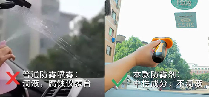 有些防雾剂之所以容易腐蚀仪表台、车膜,就是因为喷雾会滴液,成分偏强酸或者强碱。